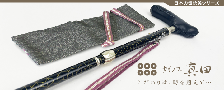 シナノのポール技術の粋を結集した国産ハイグレードモデル「グランド・カイノス」をベースに、伝統の技を伝える「真田紐」を取り入れ、六文銭をデザインしたのがこの「カイノス真田」です。