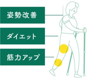 通常のウォーキングよりも全身を使うため、エネルギー消費量アップ・脚筋力アップ・姿勢改善が期待できます。